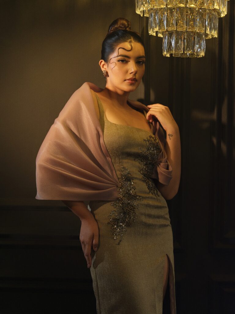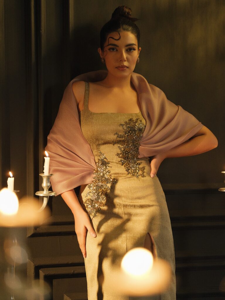 The Beige Gold Embellished Gown is an ode to timeless glamour with a modern sensual edge. Cut from a metallic golden-beige fabric, the gown contours the body with a sleek, fitted silhouette. Hand-embellished embroidery flows diagonally across the torso, creating depth and light play against the lustrous base. A daring thigh-high slit adds boldness, while the addition of a beige-toned drape softens the look — bringing a fluid contrast to the gown’s structured body. Designed to strike the balance between power and vulnerability, this piece is perfect for evening occasions where understated drama is key.