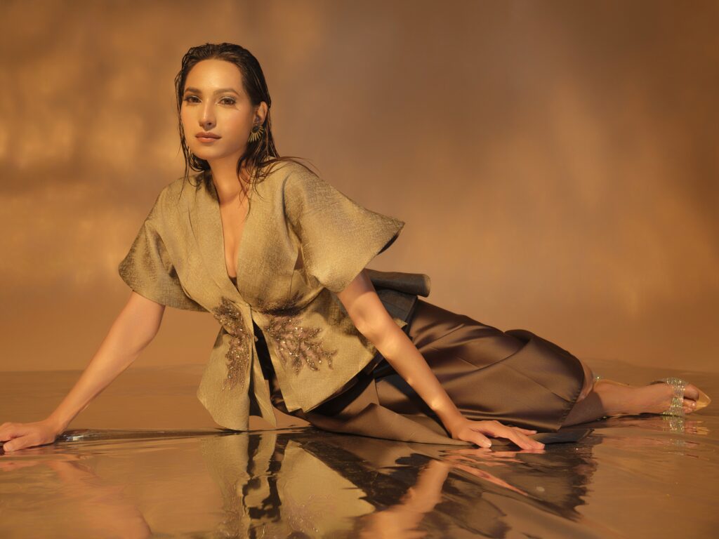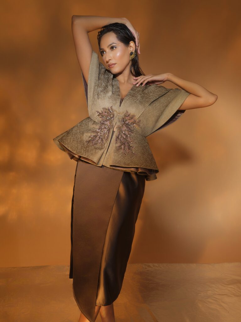 Redefine contemporary eveningwear with this dramatic three-piece ensemble designed to make a statement. The taupe-gold jacket features an architectural peplum cut with exaggerated sleeves, creating a bold yet refined silhouette. Handcrafted embellishments at the waistline add a delicate shimmer, highlighting the structured shape while drawing attention to the natural curves. Paired with a chocolate satin wrap-style skirt, the look is fluid and feminine, adding softness to the sculptural jacket. Its midi length and asymmetric hemline enhance movement, creating a harmonious balance of structure and flow.