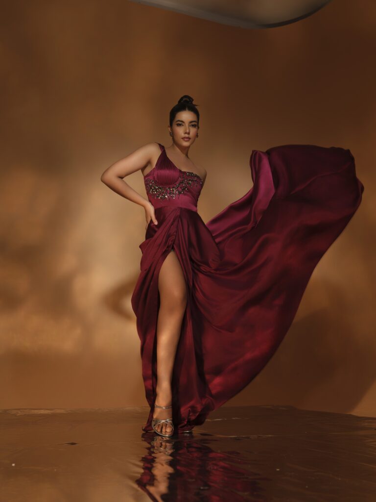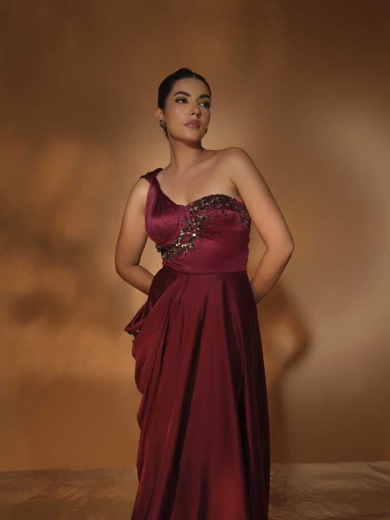 The Maroon Embellished Gown is designed for movement, drama, and unapologetic glamour. Crafted in lustrous crimson satin, the gown features a sculpted one-shoulder bodice adorned with intricate hand embroidery — a jeweled constellation that sparkles across the bust and waistline. A cinched waist flows into cascading drapes that open into a daring high slit. Bold yet elegant, this gown merges sensuality with strength, making it an unforgettable choice for red carpets, galas, or statement evenings.